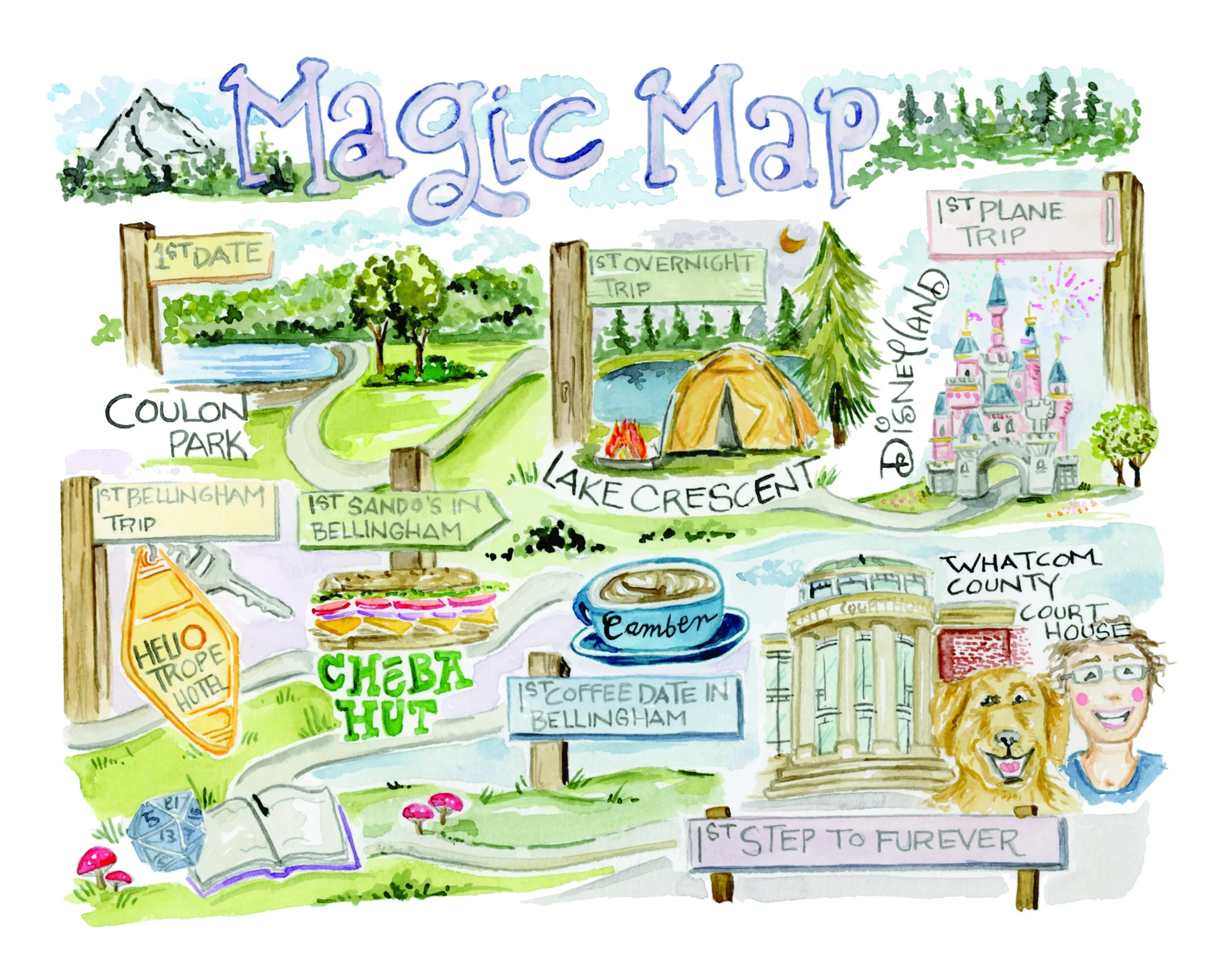 Two years ago, David Phillips, a rugged adventurer with a mysterious past, met Max Rodzon, an intelligent and spirited antiquarian with a passion for ancient Egypt. David had been touring the world and battling wraiths when he was imprisoned by a corrupt vizier after being tricked into retrieving an ancient artifact from a double haunted tomb. Max’s own globetrotting adventure of wonder and thrills was temporarily on hold, as they were looking for a place to get lunch. Serendipity led Max into the very arena where David was to be executed via sick ass fight with a wyvern. Followed always by their trusty Golden Shadow Griffin, Max halted David’s execution and in a flurry of martial prowess busted him from the prison where he was being unjustly held. Max needed David’s knowledge of the desert and the lost city of Bellinghamunaptra for an archaeological expedition to unearth a legendary Magic House known for its ability to be a wellspring of joy. Though their partnership began as a matter of necessity—David for freedom and Max for desert guidance—their journey through danger, ancient curses, and supernatural threats gradually transformed their dynamic into one of mutual respect, trust, and affection. Also Griffin was there. Two years after that fateful arena meeting, the two proposed to each other during The Case of the Madman’s Zeppelin. We thank you so much for joining us in our wedding and becoming woven into the, dense with mystery and action adventure, tapestry of our lives!